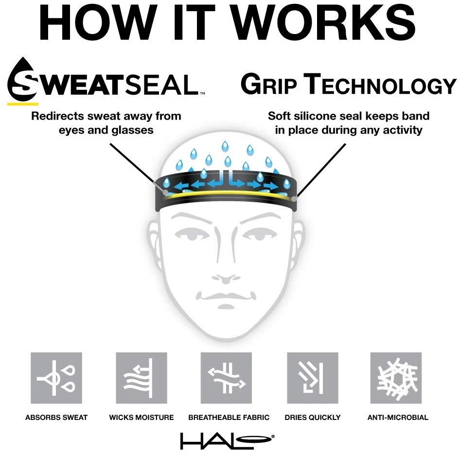 - SAY GOODBYE TO PAINFUL SWEATY BURNING EYES. Unlike traditional cotton sports headbands, the Halo head band is designed with Dryline fabric to wick away sweat without becoming heavy or bulky. Halo’s patented SweatSeal redirects salty sweat to the side and away from your eyes, face, and glasses so you never have to worry about sweat getting in your way.