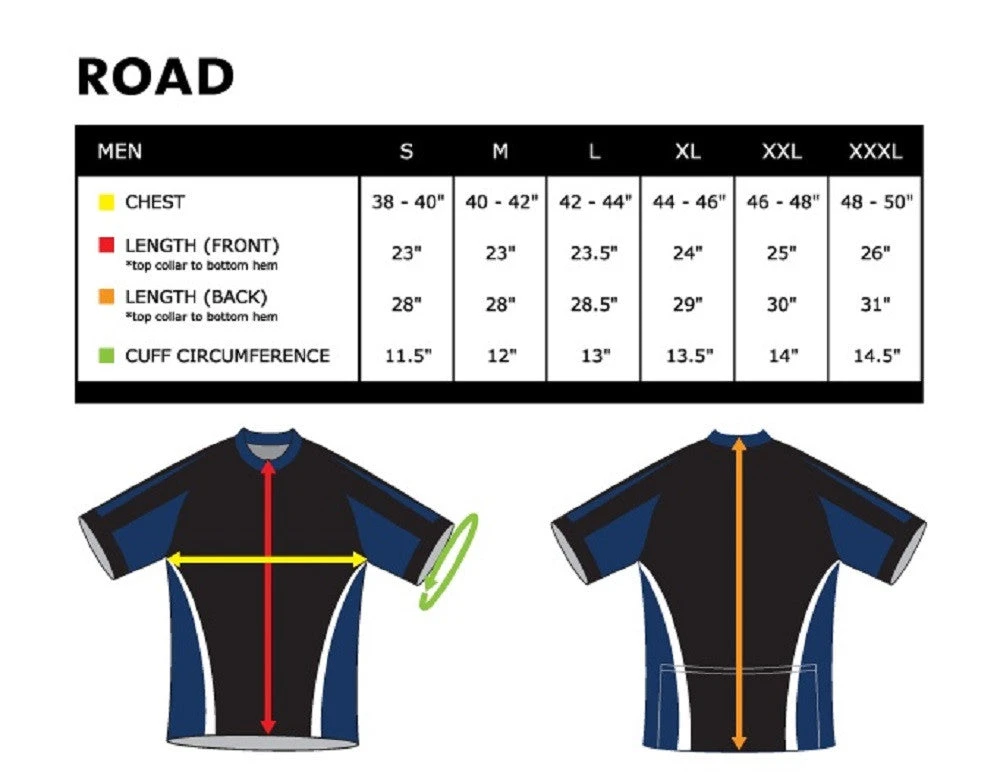 Fully sublimated road bike jersey with raglan sleeves, ¾ length hidden zipper for ventilation, and three rear cargo pockets for great storage on longer rides.