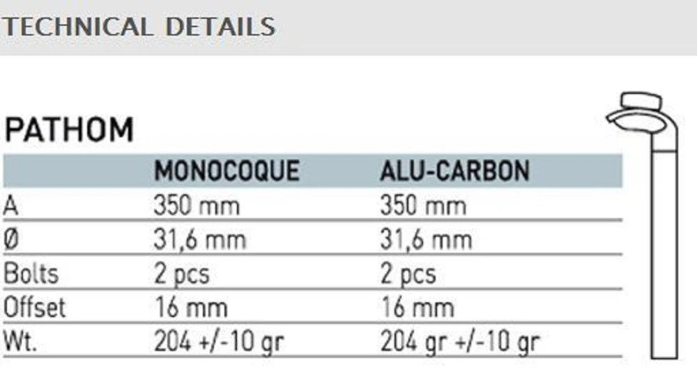 The Pathom is a great addition to any high performance bicycle. Using EPS carbon technology to ensure uniform strength throughout, ITM has created a beautiful post that is durable and easy to adjust with a light two bolt clamp system. Graphics match all ITM Pathom products.