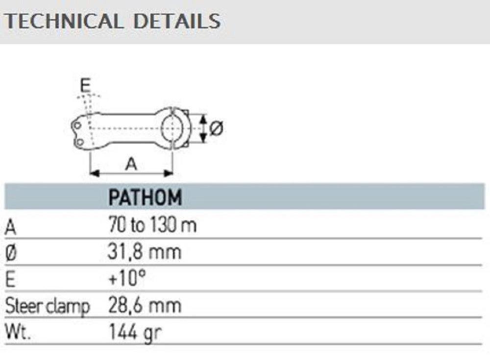 Sizes range from 70 to 130 mm with a 10 degree drop. Clamp size for the handlebar is 31.8. The graphics match Pathom seat post and handlebar. World class performance from ITM.