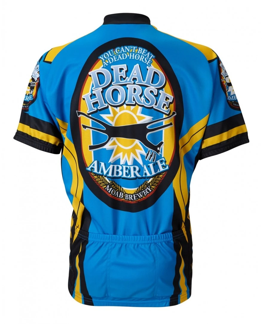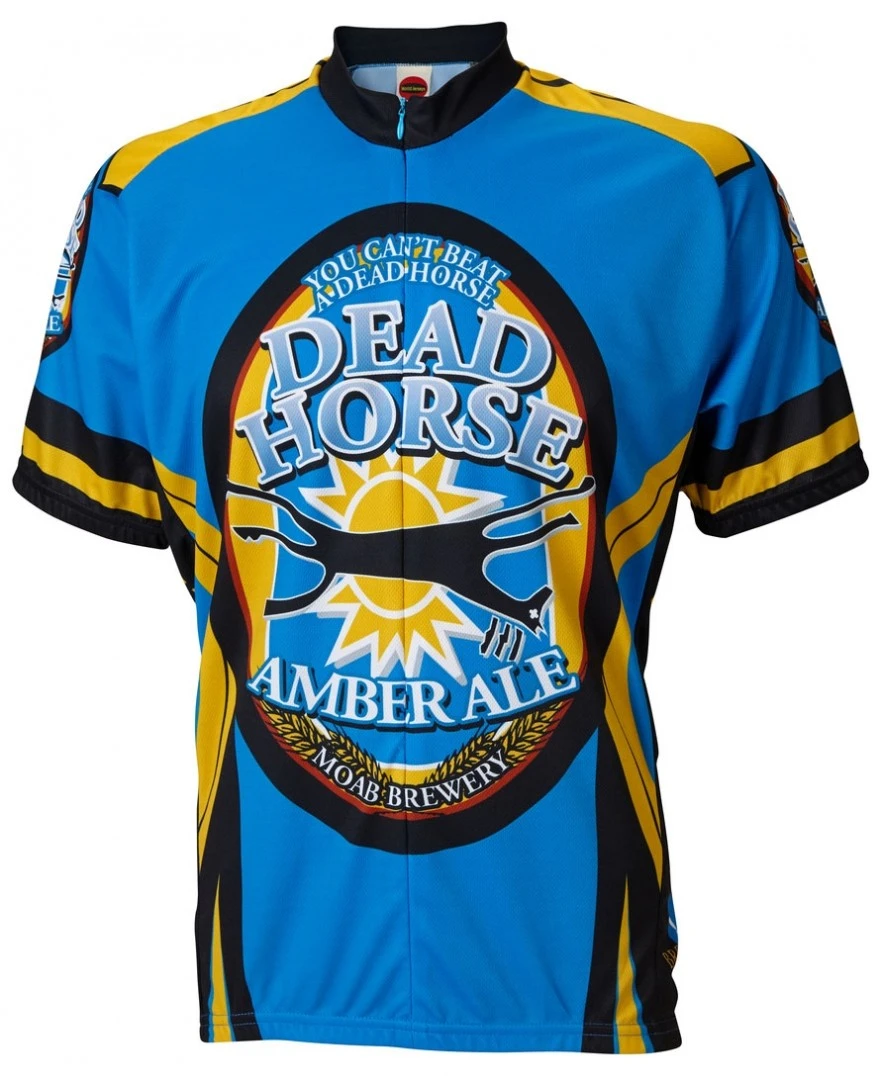 The Moab Brewery Dead Horse Ale Mens Cycling Jersey is made from 100% Polyester DrySport wicking fabric to effectively move moisture away from your skin to keep you cool and collected. Since World Jerseys’ jerseys are made to look as good as they feel, they hide the 15″ zipper to keep the pattern clean and elegant.