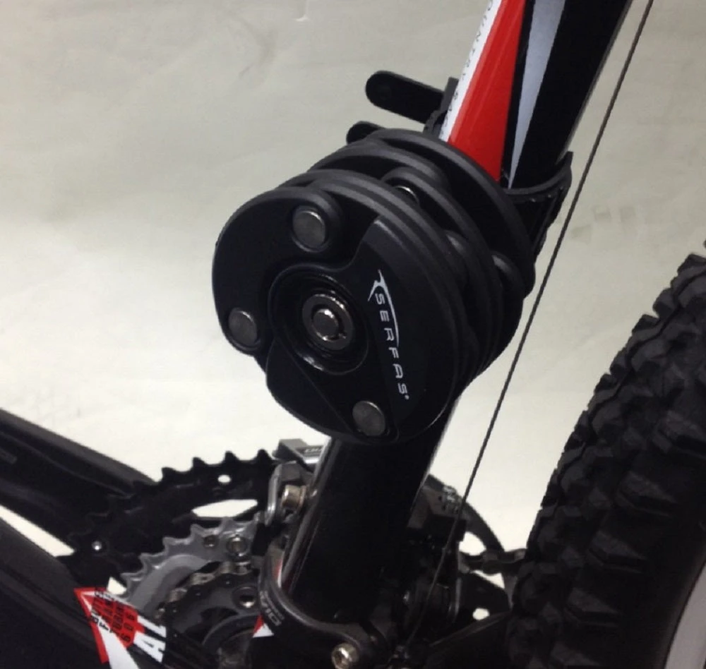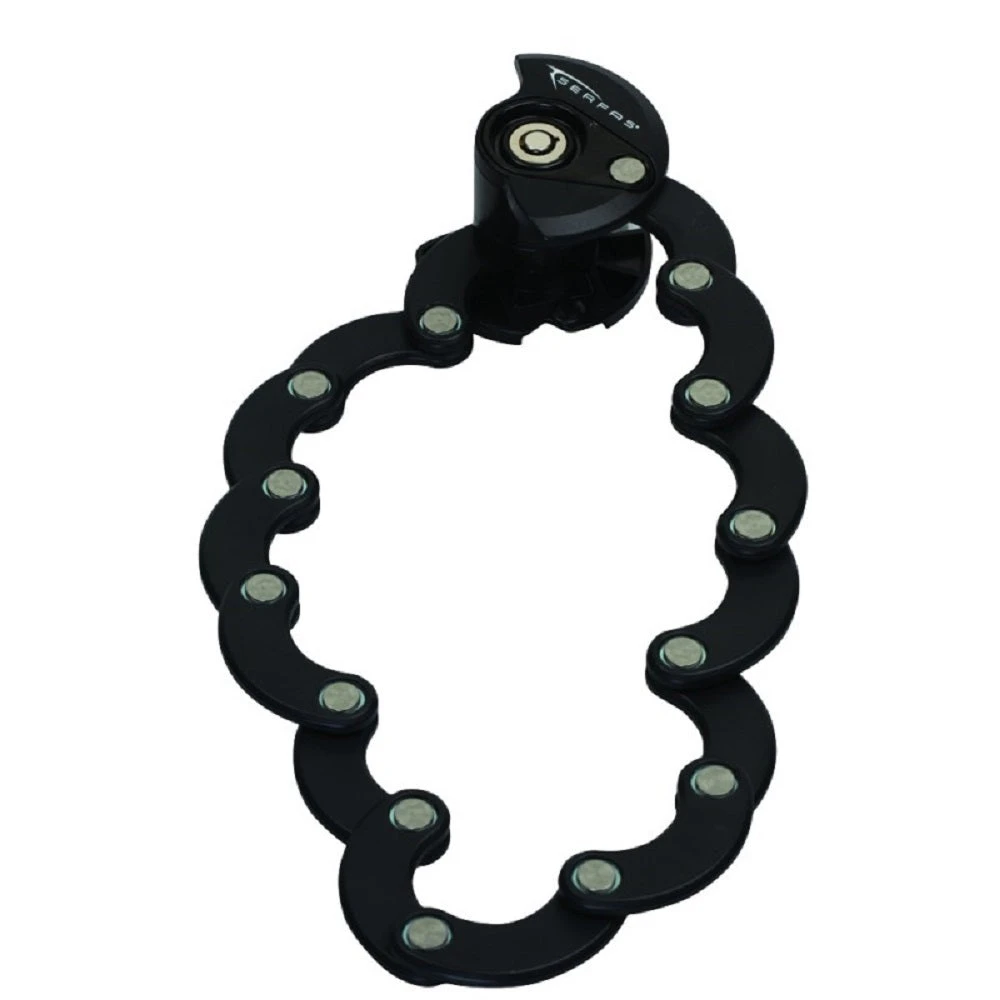 Revolutionary new steel-plated lock design that folds up to a compact self-contained unit and stores securely on your bike with its included frame mounted bracket.