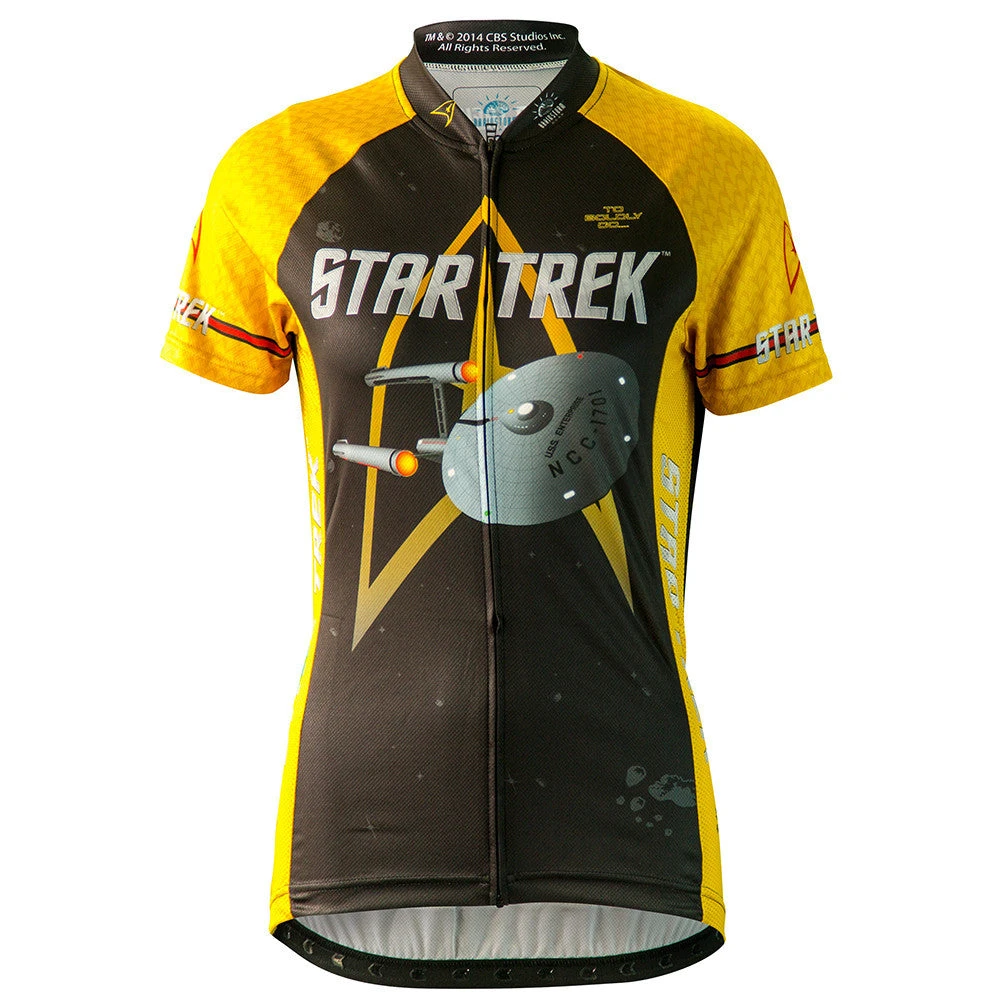 Boldly go where no cyclist has gone before! Command attention with this striking gold Star Trek jersey featuring the original USS Enterprise. The pattern is made up of alternating Starfleet badges. This is the only officially licensed Star Trek jersey this side of Rigel II.
