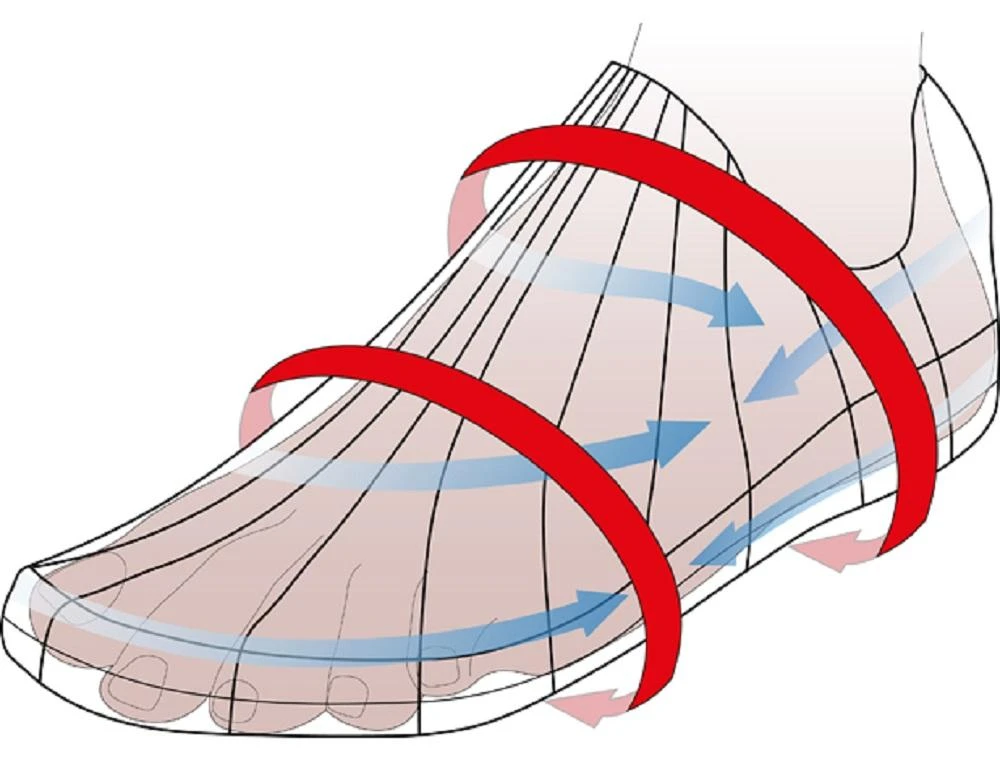 Heat-welded mesh and microfibre. Ventilated and anti-tendonitis Pebax heel cup.