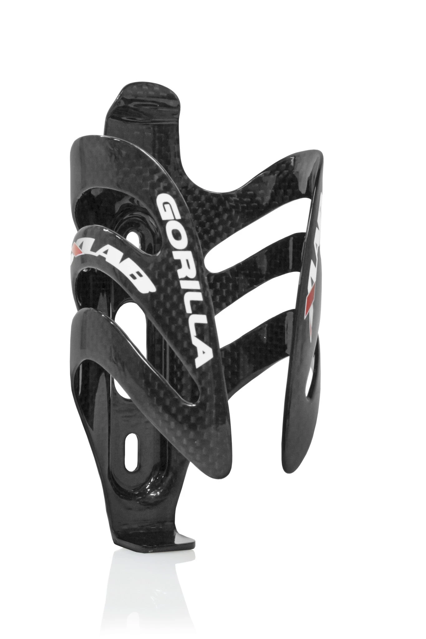 The GORILLA Cage helps prevent bottles ejecting from cages on bumpy roads, and saddle-mounted water bottle carriers. The cage has over 2X the gripping force of conventional carbon cages due to the 6 high shouldered carbon gripping fingers, tall retention tab at the top and thicker carbon material. The GORILLA cage will fit on any standard cage mounts.