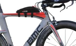 - Universal, top tube strap mounted storage. Optimized for bikes with angled stems or cables in top tube